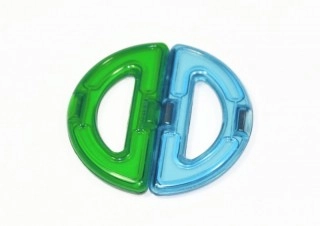 Magformers Půlkruh je nový dílek se 2 magnety vzniklý rozpůlením kruhu o jednotkovém průměru. Lze jej snadno kombinovat i s ostatními dílky. Jeho oblou stranu lze spojit s půlválcem (tvoří mu základnu) či trojcípým obloukem, viz. vyobrazené tvarové kombinace. Skladem jsou nyní jednobarevné dílky tmavě červené barvy.