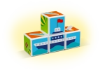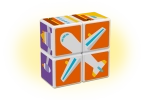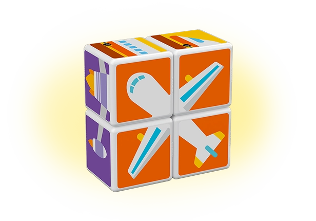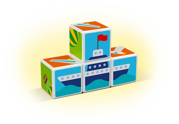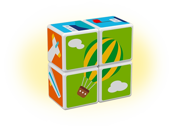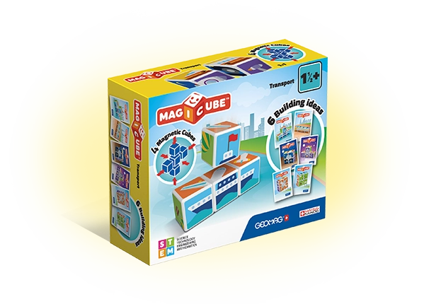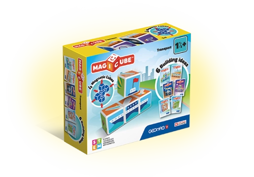 Magnetická stavebnice MAGICUBE Doprava obsahuje 4 magnetické kostičky s obrázky dopravních prostředků a 6 tipů na skládání (3 kartičky).
