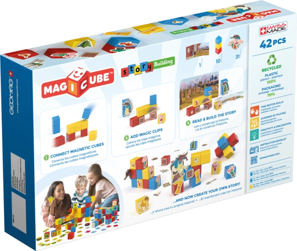 Stavebnice obsahuje 10 magnetických kostek, 31 klipů s obrázky a oboustrannou kartu s motivem domu a lesa. K tomu také brožurku s pohádkou O třech malých prasátkách v češtině a slovenštině. Vyrobeno ze 100% recyklovaného materiálu.