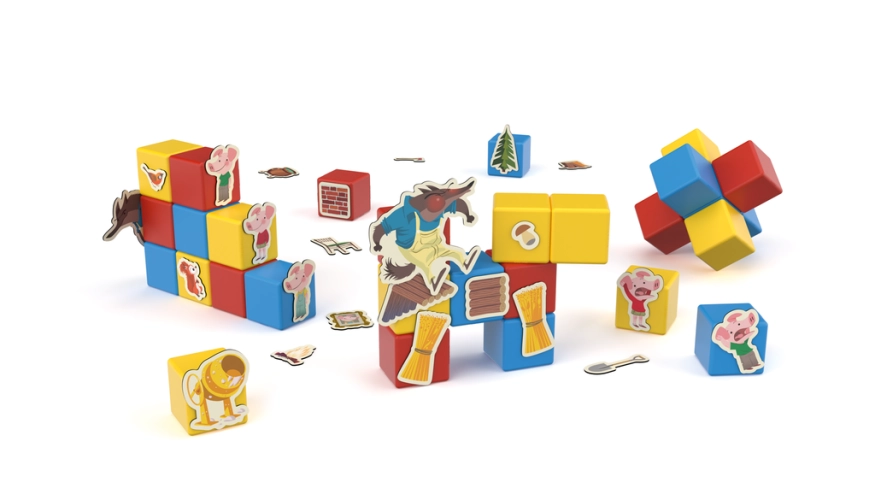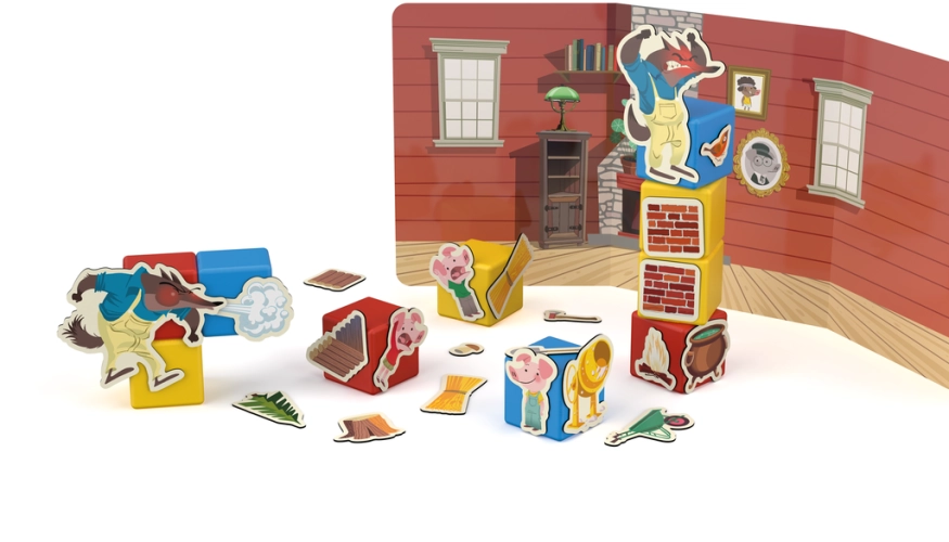Rodiče čtou pohádku O třech malých prasátkách a děti ji přikládáním klipů k magnetickým kostičkám samy vytváří. Nebo můžou vymýšlet pohádky vlastní. Součástí je text v češtině a slovenštině.