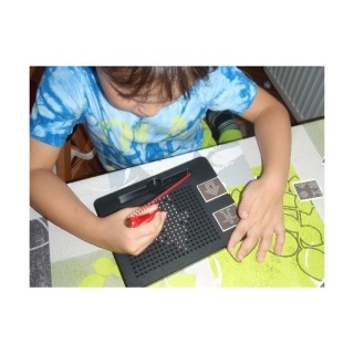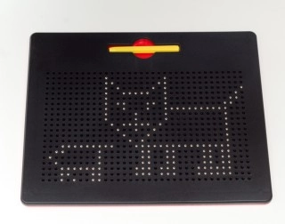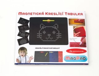 MAGPAD Big tabulka černá má mřížku obsahující 714 přesných kulatých otvorů, v nichž se díky sofistikovanému magnetickému stylusu objeví magnetické kuličky. Po přiblížení pera k tabulce, kuličky vyplní otvory a tím vznikají požadované obrazce. Prstem lze kuličky zastrčit zpět a obrázek opravit nebo vymazat.
