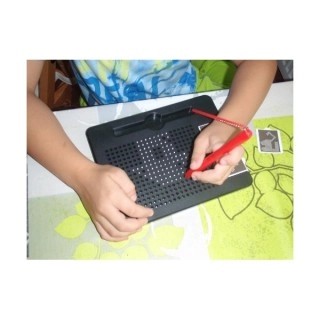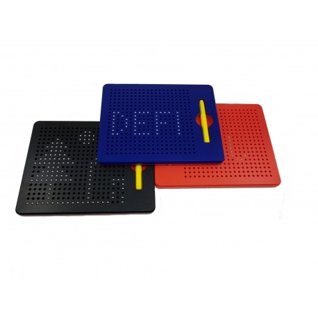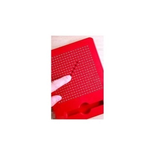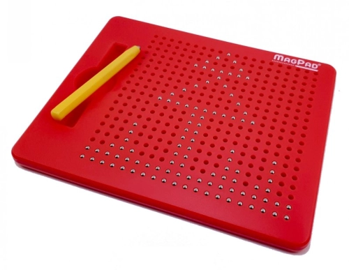 MAGPAD Mini tabulka červená má mřížku obsahující 380 kulatých otvorů, v nichž se díky sofistikovanému magnetickému stylusu (peru) objeví magnetické kuličky. Po přiblížení pera k tabulce, kuličky vyplní otvory a tím vznikají požadované obrazce. Prstem lze kuličky zastrčit zpět a obrázek opravit nebo vymazat.