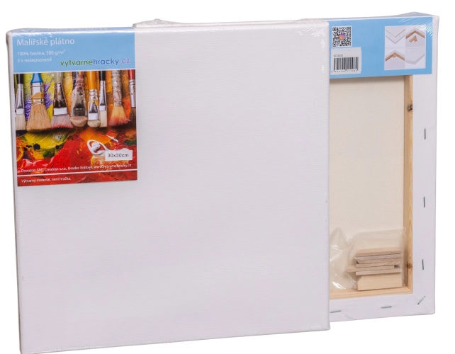 Balení obsahuje: malířské plátno 30 x 30 cm s gramáží 380 g/m2, 100% bavlna, 8 dřevěných vypínacích kolíků.