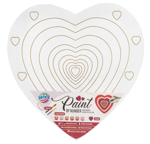 Balení obsahuje: předkreslené plátno ve tvaru srdce, 6 akrylové barvy, 2 štětce, 10 samolepicích kamínků 2 x 2 cm