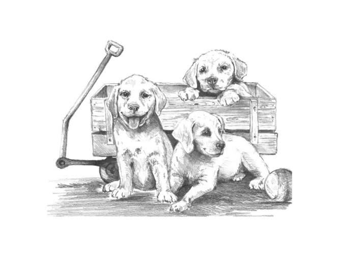 Malování SKICOVACÍMI TUŽKAMI - Štěňátka s vozíkem