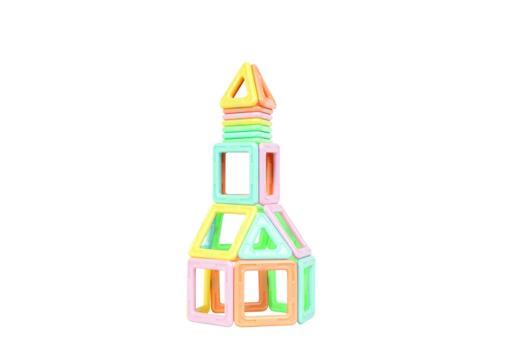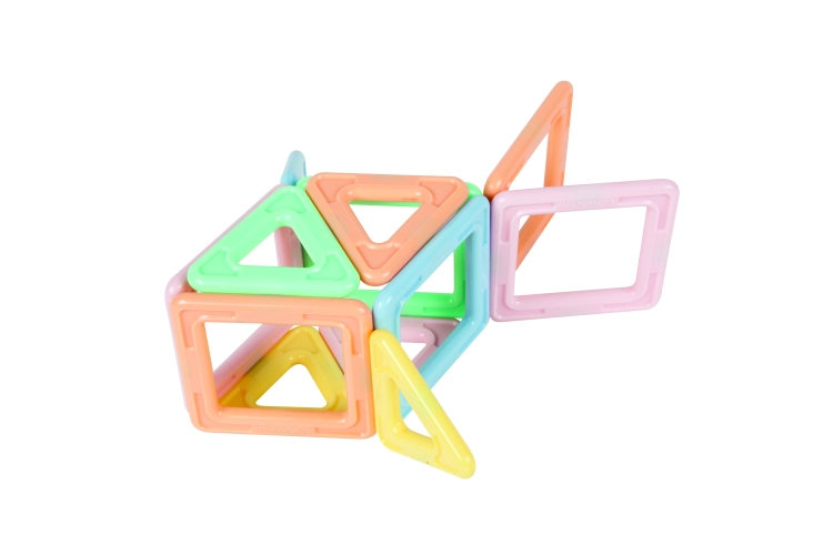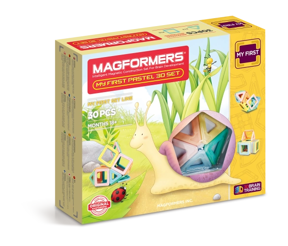 Magnetická stavebnice Můj první Pastelle-30 je obdoba setu Můj první Magformers-30 v pastelovém provedení. Obsahuje celkem 30 dílků - 18 čtverců a 12 trojúhelníků ve světle modré, zelené, růžové, žluté a oranžové barvě. Dílky jsou plnobarevné (bez klasického poloprůzračného efektu) s výraznějšími barvami navrženými speciálně pro nejmenší děti. Velmi kvalitně jsou zpracovány i přiložené výukové materiály. Děti si mohou zkoušet stavět jednoduché domečky i geom. tělesa podle návodů na velkých odolných kartách (10 různých předloh).