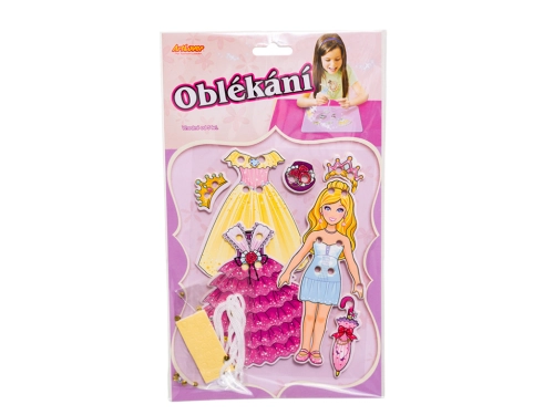 Provlékáním šňůrek dírkami oblékáte postavičky. Nakonec dozdobíte korálkami a máte hotovo. Pro opakované použití, podporuje jemnou motoriku malých dětí. Obsahuje 1 dřevěnou postavičku a oblečení, oboustranně lepících kolečka, korálky a šňůrku.