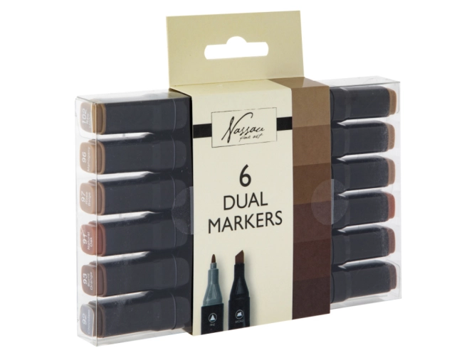 Sada obsahuje: 6 oboustranných fixů v různých odstínech hnědé.
