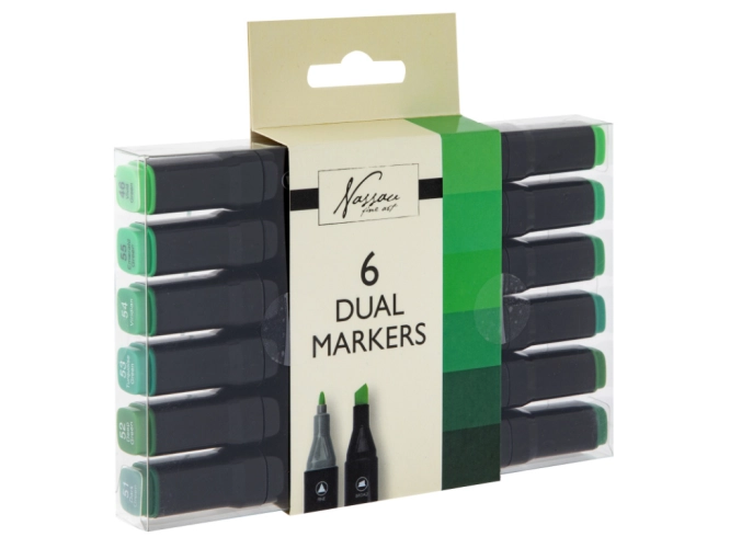 Sada obsahuje: 6 oboustranných fixů v různých odstínech zelené.