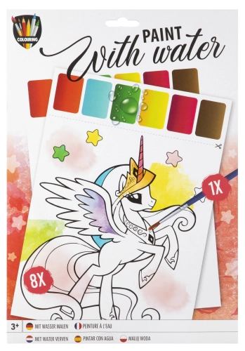 Návod: Ponořte přiložený štětec do nádobky s vodou a vybarvěte obrázek pomocí přiložených barev.