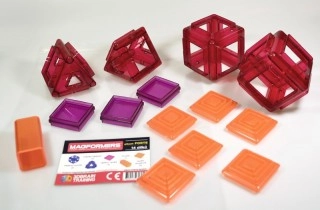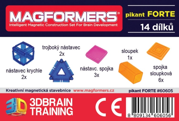 Magformers Pikant FORTE obsahuje celkem 14 dílků: 2 nástavce krychle, 2 nástavce trojboké, 3 nástavcové spojky, 6 spojek pro sloupek a 1 nástavcový sloupek. Pikant forte je doplněk k magnetickým dílkům (žádné magnety neobsahuje). Výsledné stavby zpevňuje a zároveň výrazně zlevňuje. Z nástavců můžete tvořit základní kostru, na kterou se dále připevňují klasické čtverce, obdélníky nebo mřížky i trojúhelníky, konstrukce se tak dále větví tradičním způsobem. Nástavce lze spojkami i sloupkem připevňovat k sobě navzájem nebo linbovolně prokládat magnetickými tvary. Vhodné pro korpusy aut nebo nosné konstrukce architekt. staveb. Spojky lze využívat i jako dekorační porvek pro uzavření čtvercových otvorů v nástavcích.