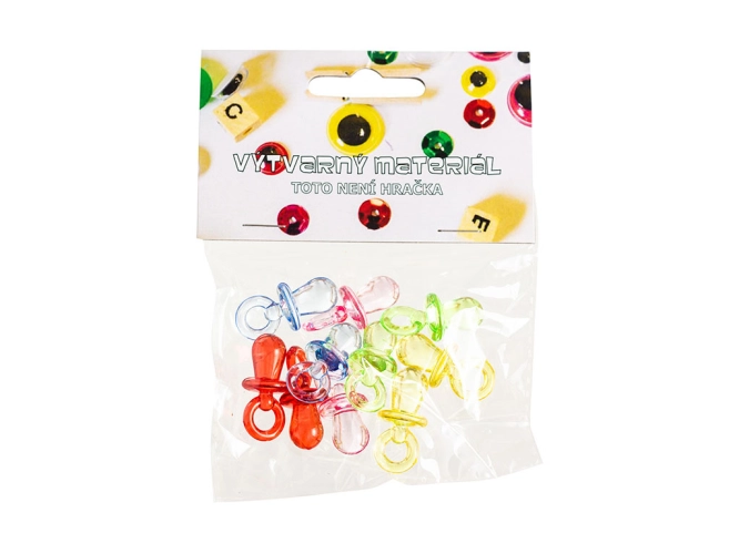 Tato sada obsahuje 10 plastových dudlíků o průměru 3 cm, které jsou skvélé pro širokou škálu kreativních projektů. Dudlíky jsou k dispozici v různých živých barvách, což je činí ideálními pro scrapbooking, výrobu dekorací, přáníček, nebo jako zábavný doplněk k narozeninovým nebo baby shower tématům. Díky pevnému plastovému materiálu jsou dudlíky odolné a snadno se s nimi pracuje. Skvělé pro děti i dospělé, kteří se věnují ručním pracím, DIY tvorbě a chtějí přidat roztomilý a veselý prvek do svých výtvorů.
