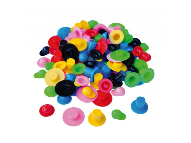 Různobarevné plastové kloboučky a kšiltovky - 48ks. Velikost od 2cm do 3,5cm. Barevný mix přímo od výrobce - nelze ovlivnit barvy.