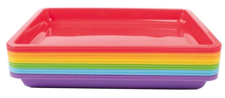 Pro dětskou hru jsou tácy ideálním pomocníkem. Korálky se jim nerozkutálí po stole nebo po zemi, pískem či hlína se nerozsype všude okolo. Tácy se taky vhodné na montessori hru. Děti mohou rozdělovat barevné kuličky podle barev.