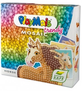 PlayMais Trendy Mosaic HORSE jsou mozaiky s motivy koní. Malé dílky z kukuřičného škrobu v úžasných barvách (3000 ks) mají tvar kuliček, které děti vlepují na obrázkové předlohy a vytváří tak mozaikový obrázek. Nepoužívá se lepidlo, kuličky se pouze navlhčí a přitisknou. Kreativní stavebnice PlayMais Trendy Mosaic HORSE obsahuje kromě kukuřičných pěnových dílků i návod s inspiracemi, vlhčící houbičku a 6 předloh z tvrdého papíru.
