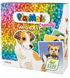 PlayMais Trendy Mosaic DOG jsou romantické mozaiky s motivy pejsků. Malé dílky z kukuřičného škrobu v úžasných barvách (3000 ks) mají tvar kuliček, které děti vlepují na obrázkové předlohy a vytváří tak mozaikový obrázek. Nepoužívá se lepidlo, kuličky se pouze navlhčí a přitisknou. Kreativní stavebnice PlayMais Trendy Mosaic DOG obsahuje kromě kukuřičných pěnových dílků i návod s inspiracemi, vlhčící houbičku a 6 předloh z tvrdého papíru.