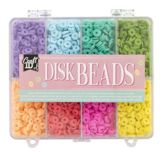 8 barev gumových korálků - Ø korálku 6 mm, Ø průvleku 2 mm, výška korálku 1 mm v praktické plastové krabičce.