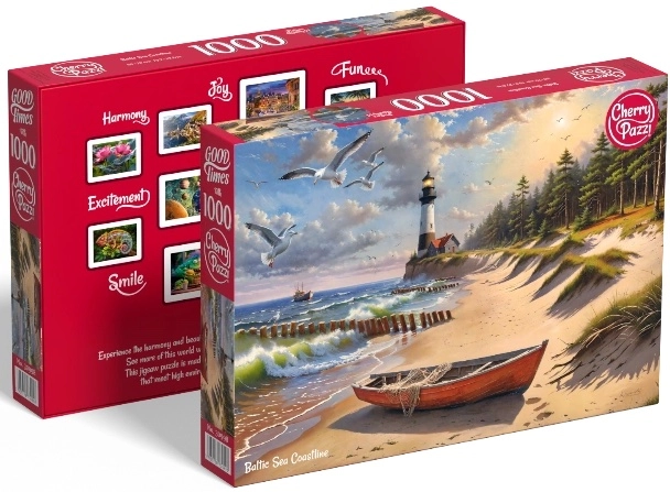 - Klidný motiv: Nádherná ilustrace pobřeží Baltského moře s typickými dřevěnými chátkami, majákem a šumivým mořem vám přinese klid a pohodu.