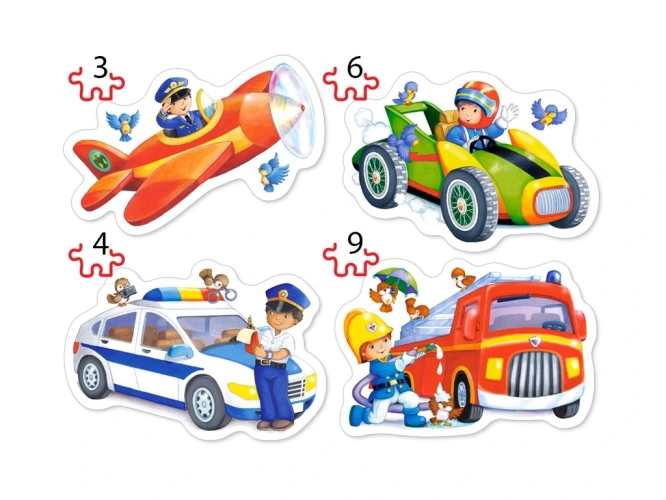 Puzzle Castorland se skládají ze 4 obrysových obrázků s odlišným počtem dílků - 3, 4, 6, 9 ks, které do sebe přesně zapadají. Po spojení všech dílků získáte požadovaný obrázek. Dílky jsou z tvrdého, pevného, kvalitního materiálu. Puzzle rozvíjí kreativní a logické myšlení.