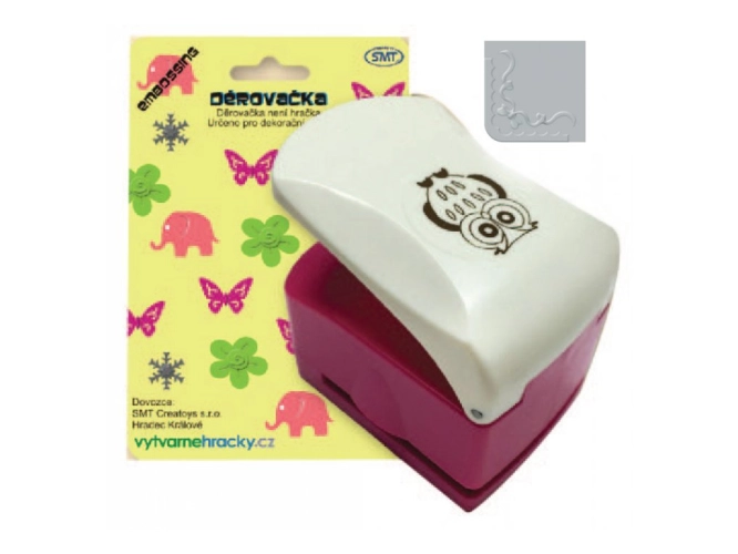 Děrovačka pro výtvarnou tvorbu. Velikost výseku 32 mm. Postup: 1. pracujte s děrovačkou na pevné a rovné ploše. 2. vložte papír vhodné tloušťky - 160-240 g/m2 a zatlačte na páku statickým tlakem. Nikdy ne úderem na páku. 3. po proděravění opatrně vytáhněte zbylý papír. 4. POUŽÍVEJTE POUZE NA PAPÍR. Děrovačky nikdy nepoužívejte na materiály potažené lepící vrstvou (například na samolepicí štítky), na pěnovku, na papírové ubrousky. 5. raznici lze ostřit slabou hliníkovou folii a mazat voskovým papírem. 6. DOPORUČUJEME DĚROVAČKU VYČISTIT PO 3. POUŽITÍCH - odklopte páku raznice, vyjměte kolečko pod pákou a úzkým předmětem odstraňte přebytečné papírky. Děrovačka není hračka.