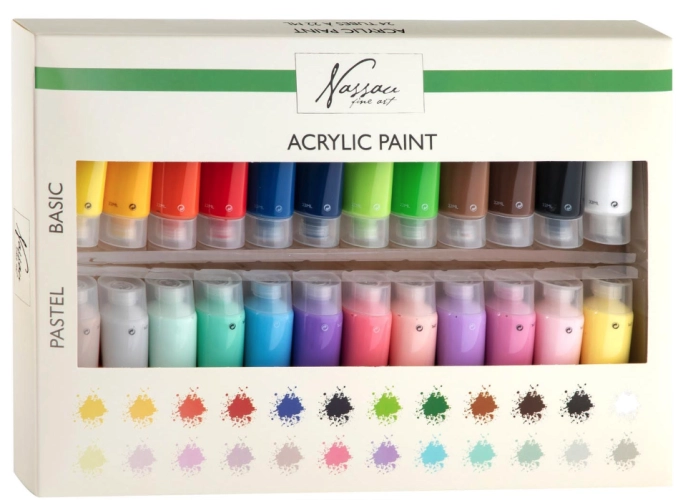 Univerzální sada akrylových barev – 24 x 22 ml je ideální pro tvoření na široké spektrum povrchů. Barvy můžete použít na papír, dřevo, sklo, keramiku, textil, modelovací hmotu, malířské plátno i kameny. Skvělé pro domácí tvoření, školní projekty i hobby umění.