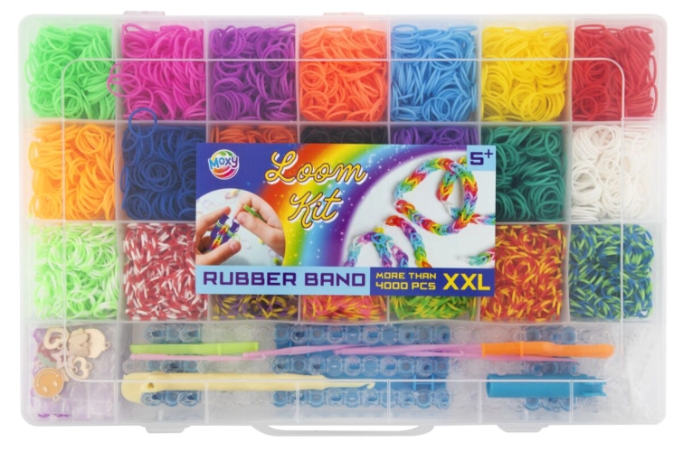 Sada obsahuje: 4000 ks barevných gumiček ( neobsahují latex), pletací špulku, platící destičku, háček, ozdoby.