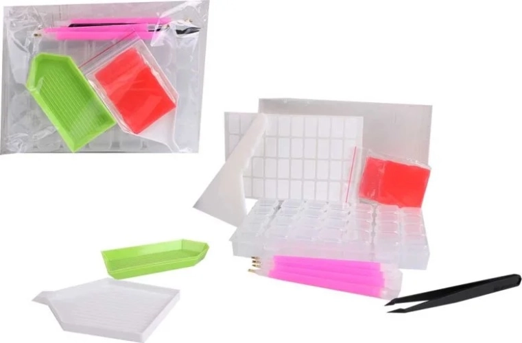 Tato sada příslušenství Vám pomůže při tvoření diamantových obrázků. Pera s různými hroty Vám pomůžou rychleji uspořádat kamínky do obrázků. V zásobníku si diamanty zorganizujete a rozložíte. Pomocí pinzety opravíte špatně přilepený kamínek.