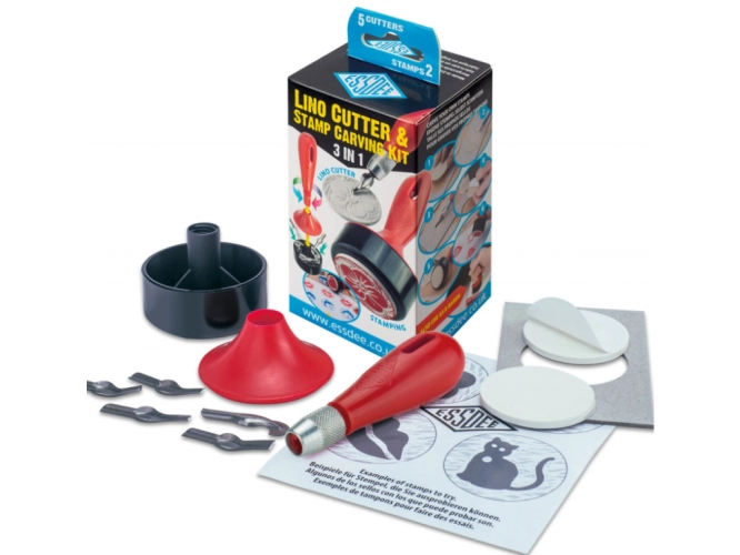 Linorytová sada s 5 různými noži a s rozkládací násadkou, která je zároveň i pouzdro na nože. Ve složeném stavu jí můžete použít místo grafického lisu a obrázek uhlazovat přímo s ní. Tato sada je vhodná pro začátečníky.Sada pro linoryt obsahuje - 5 různých nožů (rydel), plastový držák s kovovou objímkou pro uchycení rydla, 2 samolepící kulatá lina o průměru 4,5 cm vhodných na výrobu razítek, pečetí... Vyrobeno v Anglii.