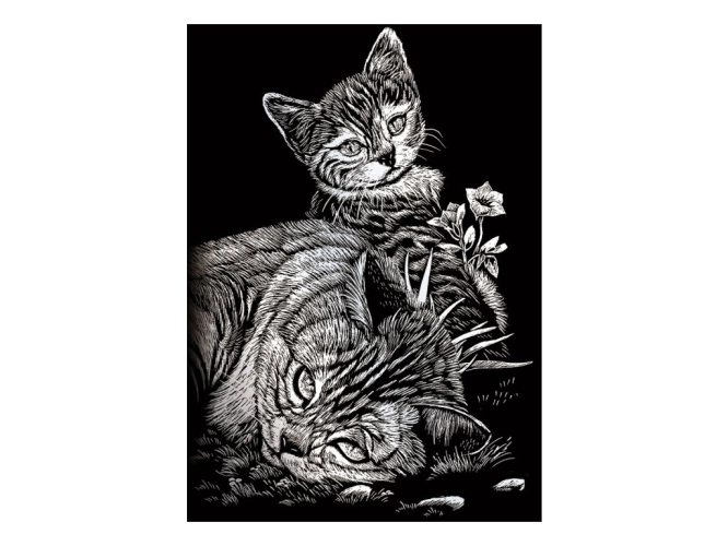 Seškrabovací obrázek- mini- Stříbrný- Kočička a kotě