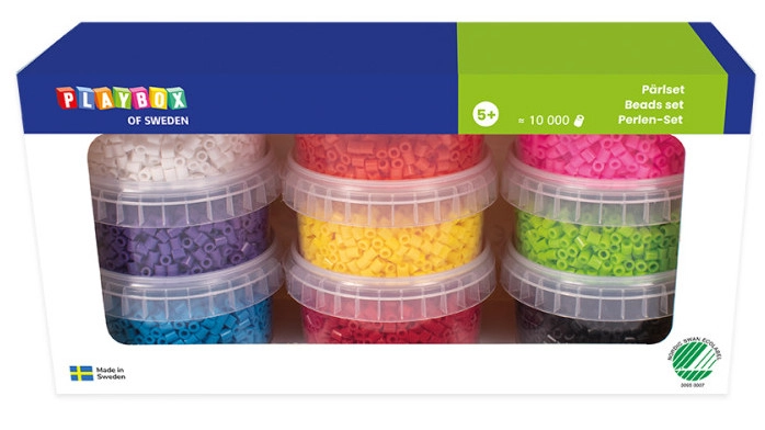 Balení obsahuje: 10 000 ks zažehlovací korálků o průměru 5 mm - 9 barev (bílá, žlutá, oranžová, červená, růžová, fialová, modrá, zelená, černá).