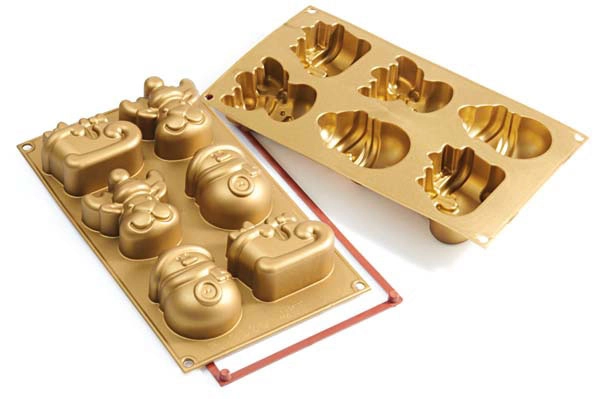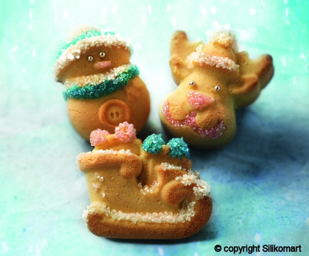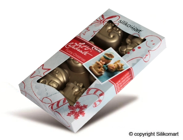 Kvalitní silikonová forma Funny Christmas od Silikomart z řady Let's Celebrate na pečení 6 ks větších zákusků ve tvaru saní, sněhuláka a soba. Silikonová forma je opatřená bezpečnostním rámečkem (SAFE RING) pro lepší manipulaci s formou. Formička je zabalená v pěkné papírové krabičce. Vyrobeno v Itálii.