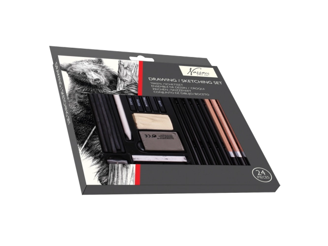 3x uhlová tužka( měkká, střední, tvrdá), 3x skicovací tužka (2H, HB, 2B), 2x uhlová tužka bez dřeva, 2x pastelová křída, 5x tyčinka na dřevěné uhlí ( 2xtvrdá, 2x střední, 1x měkká).