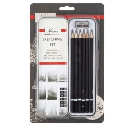 Sada obsahuje: 6 grafická tužka ( 4H, 2H,HB,B,2B,4B), 1x ořezávátko na tužky, 1x plechové pouzdro.
