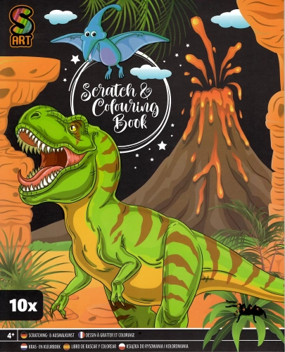 Sada obsahuje 10 škrabacích obrázků a 10 omalovánek s motivem dinosaurů, škrabátko.