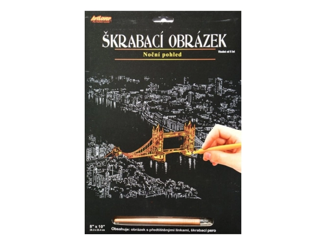 Škrabací obrázek zlatý 20 x 25 cm Sada obsahuje obrázek natištěný na černém kartonu a umělohmotné škrabací pero s kovovým hrotem. Seškrabte linky předtištěného obrázku. Vhodné pro děti od 6 let.