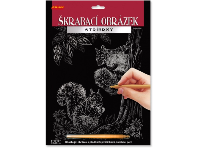 Škrabací obrázek stříbrný 20 x 25 cm Sada obsahuje obrázek natištěný na černém kartonu a umělohmotné škrabací pero. Seškrabte linky předtištěného obrázku. Vhodné pro děti od 6 let.