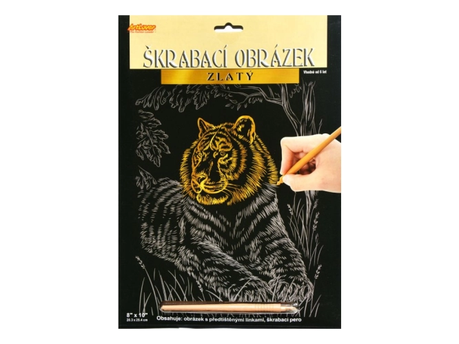 Škrabací obrázek zlatý 20 x 25 cm Sada obsahuje obrázek natištěný na černém kartonu a umělohmotné škrabací pero. Seškrabte linky předtištěného obrázku. Vhodné pro děti od 6 let.