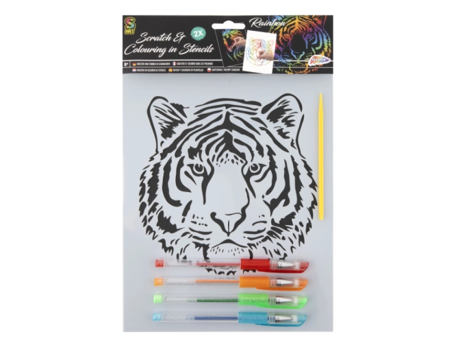 Obsahuje: 4x prázdný škrabací papír, 1x škrabací pero, 2x šablonu,2x bílý papír, 1x černý papír, 4x gelové tužky,