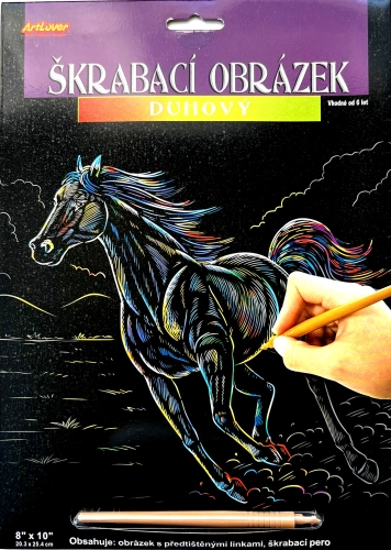 Škrabací obrázek duhový 20 x 25 cm Sada obsahuje obrázek natištěný na černém kartonu a umělohmotné škrabací pero. Seškrabte linky předtištěného obrázku. Vhodné pro děti od 6 let.