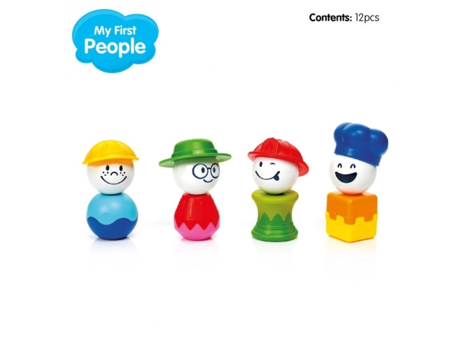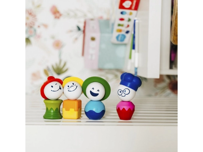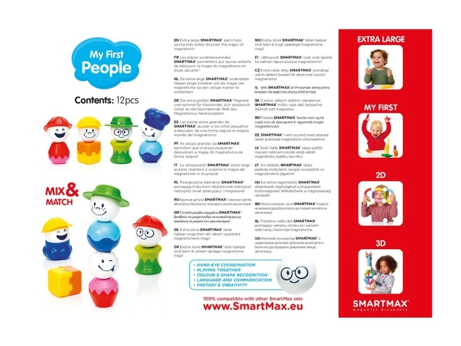 Sada SmartMax - Moji první lidé obsahuje 4 obličeje, 4 těla, 4 klobouky. Děti si mohou vytvořit kuchaře, stavitele, zahradníka, hasiče. Nebo mohou zapojit fantazii a vytvořit si vlastní vzhled lidí.