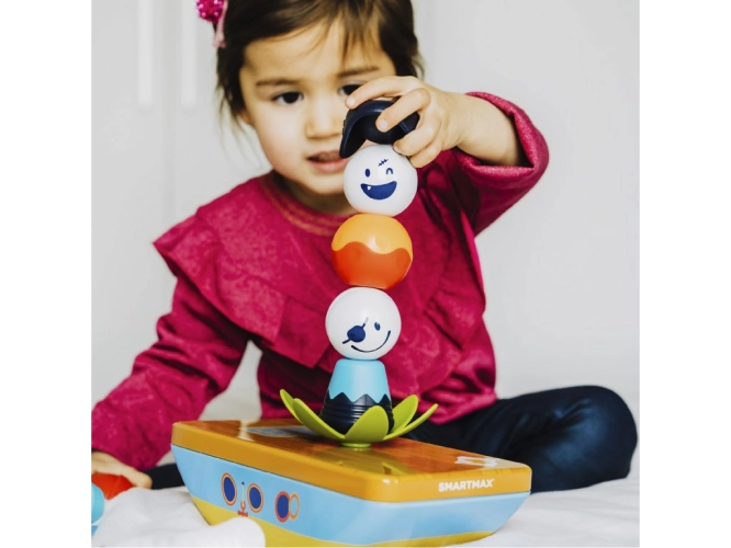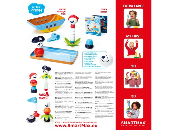 Stavebnice SmartMax - Moji první piráti je kompatibilní se všemi ostatními stavebnicemi SmartMax. Děti mohou rozvíjet svou kreativitu, koordinaci ruka-oko a rozpoznávat barvy a tvary, zatímco se baví v roli neohrožených pirátů. Magnetické prvky, jako jsou koule, těla, klobouky, flexibilní tyč, květina a vlajka, umožňují dětem tvořit a skládat podle vlastní fantazie.