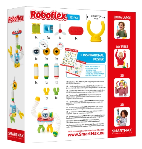 Kdo řekl, že roboti nejsou ohební? Buďte kreativní a vytvořte si vlastní flexibilní, bláznivé roboty! Je to jednoduché. Vyberte si magnetické dílky, ohněte je, roztáhněte, spojte pomocí magnetů dohromady a hrajte si! Nové, flexibilní, roztažitelné magnetické tyčky dodávají herní sadě SmartMax další rozměr. Chcete, aby váš robot skákal, létal či zvedal činku?