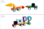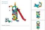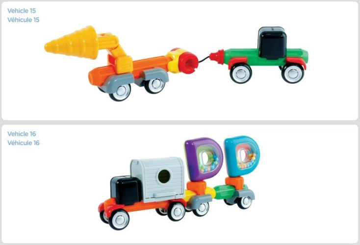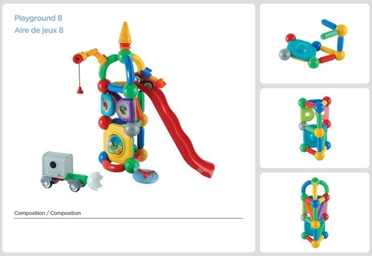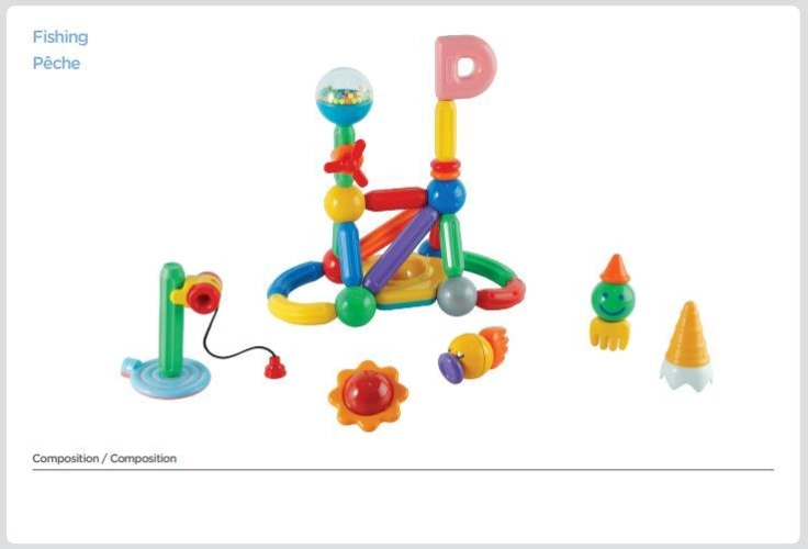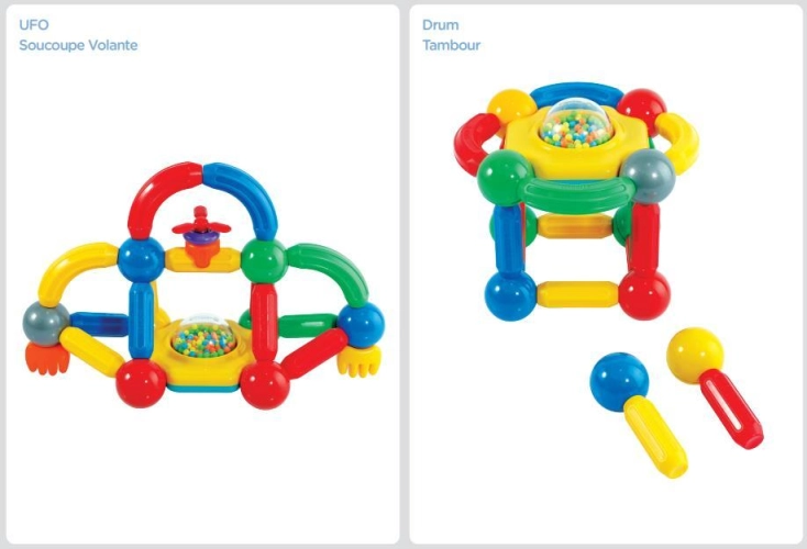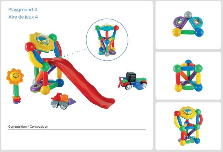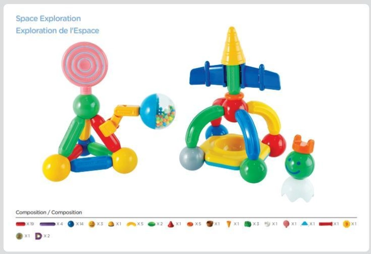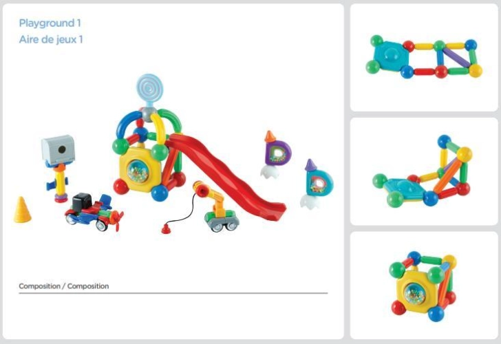 12 krátkých tyček, 3 dlouhé tyčky, 4 oblouky, 8 koulí, 2 koule - smajlík, 2 čepičky, vrtule, kornout, pánvičku, 3 disky, 2 kloboučky, 4 podvozky s kolečky (2 typy), 2 skořápky, rameno jeřábu, naviják, tmavou kabinku, korbu s dvířky, 2 hřebínky, kvítek, 2 malá křídla, velká křídla, chrastítko koule, 2 chrastítka ve tvaru D, disk s kulovou prohlubní, skluzavka a 2 výukové sešity s návody a inspiracemi (2D stavění v ploše a konstrukce 3D modelů)