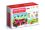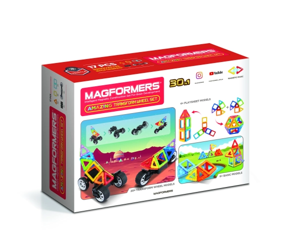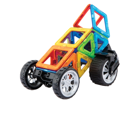 Jeden podvozek je obdařen masivními koly, která lze nezávisle na sobě natáčet až o 90°, takže je využijete pro modelování jedno i dvoustopých vozidel. Druhý podvozek je klasická náprava s 2 propojenými koly, u níž můžete nastavit 3 různé výškové polohy propojovací desky, což přijde vhod pro různě odvážné karoserie čtyřkolek a bugyn. V kombinaci s jakýmikoliv dalšími dílky Magformers pestrost i velikost vozidel násobně narůstá. Většina ze stovek postavených aut a motorek z této stavebnice je i překvapivě odolná a lze je tudíž směle využívat i jako funkční hračku.