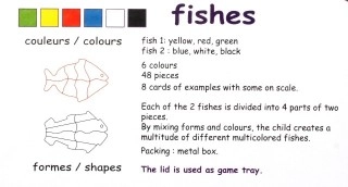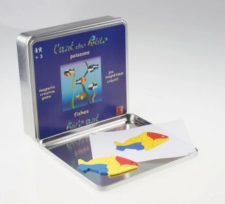 Magnetická skládačka RYBIČKY z řady Umění hrou učí děti harmonii tvarů a barev, rozvíjí jejich představivost a probouzí kreativitu. Dva typy rybiček jsou rozděleny na 2 části, které se dělí na další 4 části. Kombinací tvarů a barev můžeme vytvořit velké množství barevných rybiček. Vyrobeno ve Francii z kvalitních certifikovaných materiálů, dílky jsou omyvatelné.