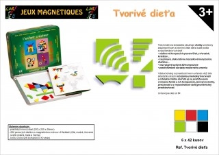Umění hrou - TVOŘIVÉ DÍTĚ je magnetická mozaiková skládačka pro děti od 3 let. Prostřednictvím umělecky zajímavých tvarů mohou děti vytvářet nádherné kompozice postaviček, zvířátek, květin, dekorativní mozaiky... Obrázky lze skládat na kovové víčko krabičky nebo na ledničku.Vyrobeno ve Francii z kvalitních certifikovaných materiálů. Dílky jsou omyvatelné.