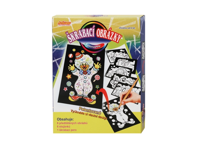 Sada obsahuje 6 předtištěných obrázků, 6 stojánků, škrabací pero. Velikost obrázků 15x10cm. Jednoduché a zábavné, pro děti cca od 6 let.
