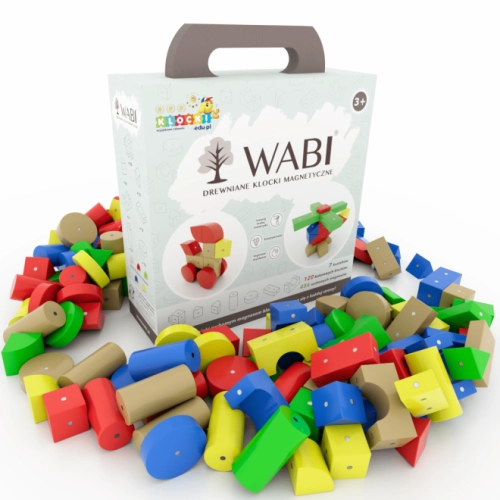 Dřevěná magnetická stavebnice WABI 120 obsahoje 120 dřevěných kostek s magnety. Díky 456 pohyblivým magnetům se kostky snadno spojují ze všech stran. Kostky mají 7 tvarů a jsou v 5 barvách. Kostky jsou uloženy v pěkné papírové krabici. V krabici naleznete taky knížečku s návody a pytlík na kostky.