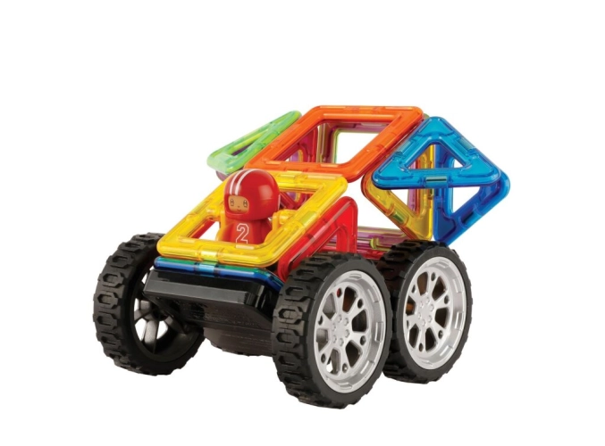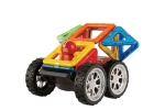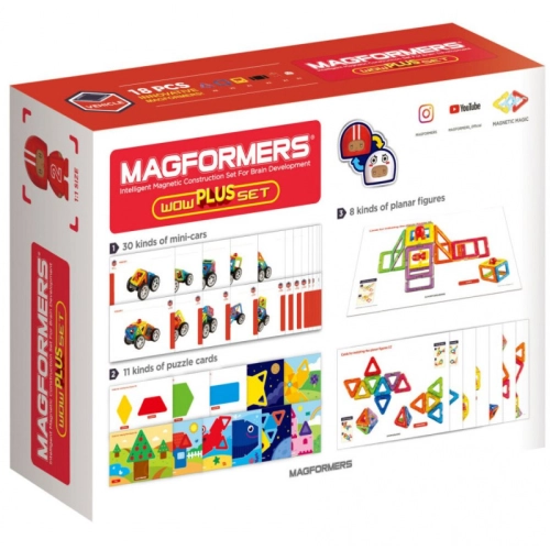 Stavebnice Magformers Wow Starter Plus obsahuje celkem 18 dílků a 8 výukových karet: 8 trojúhelníků, 5 čtverců, 1 otočná sedačka plus, 1 výměnná figurka, 1 helma, 2 podvozky s kolečky.