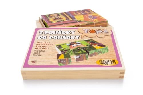 Kostičky s názvem Z pohádky do pohádky jsou uloženy v dřevěné krabičce. Kostiček je celkem 12 (formát 3x4 ks, rozměr 3,7 cm). V krabičce jsou dále volně vloženy obrázky sloužící jako předlohy pro skládání.